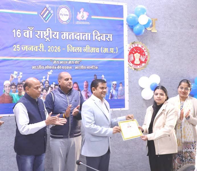 नीमच।अपर कलेक्टर बी.एस. कलेश की अध्यक्षता में 25 जनवरी 2026 को 16वां राष्ट्रीय मतदाता दिवस समारोह जिला पंचायत सभाकक्ष नीमच में आयोजित किया गया। इस अवसर पर एसडीएम श्री संजीव साहू,डिप्टी कलेक्टर श्री पराग जैन,श्री चंद्रसिंह धार्वे,सुश्री श्रुति भयडिया सहित जिला अधिकारी विभिन्न विभागों के अधिकारी-कर्मचारीगण उपस्थित थे।
